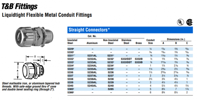 El conector hermético a líquidos 5233 Thomas & Betts de la serie 52® une un conducto metálico flexible de 3/4 de pulgada a una caja o recinto. El conector está construido de acero y está listado por UL y certificado por CSA.