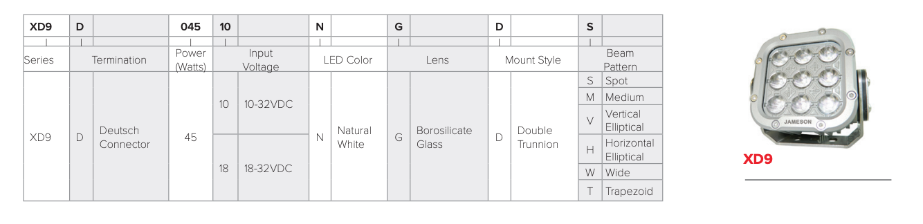 Todos los modelos de esta serie XD9 Jameson; tienen terminación Deutsch Connector, 170 Watts, LED Color Blanco Natural, Lente de Borosilicato y montura Doble Muñón.